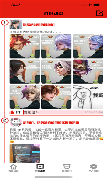 社区动态:可以在这里发表自己的文章,寻找组队开黑聊得来的小伙伴;