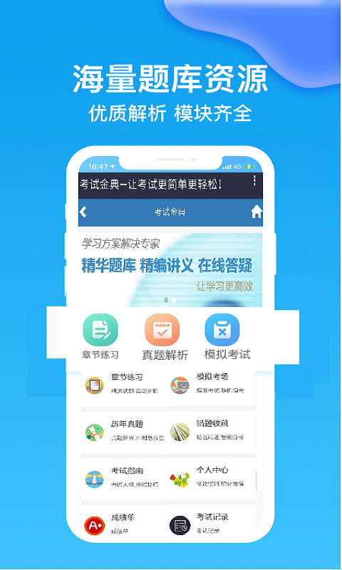 【独特性】拥有模拟考场,错题重做,学习记录,查找试题,随机练习,统计分析等功能!