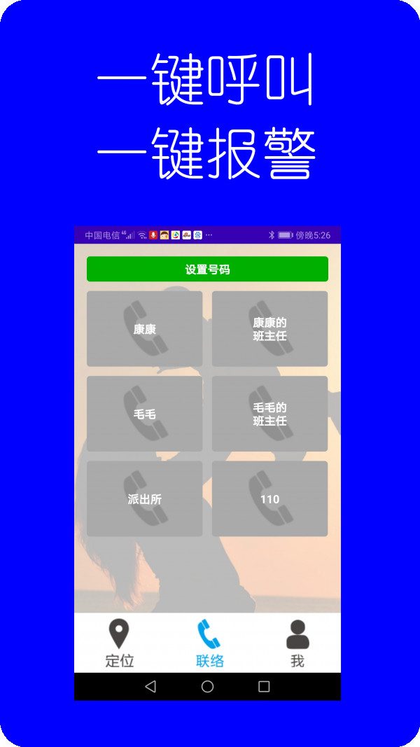 - 支持一键拨打电话联络家长、孩子、班主任、派出所和报警