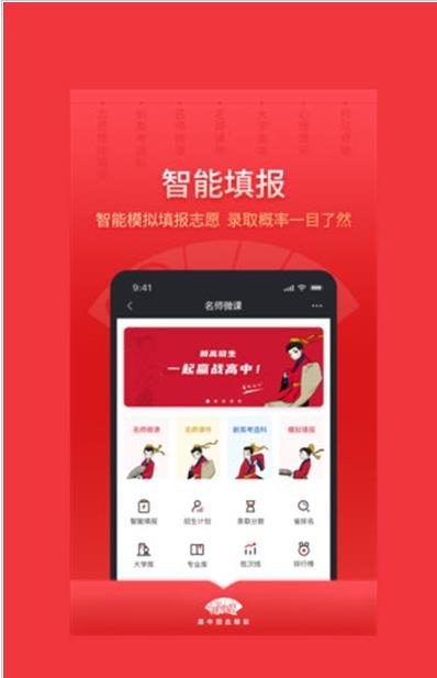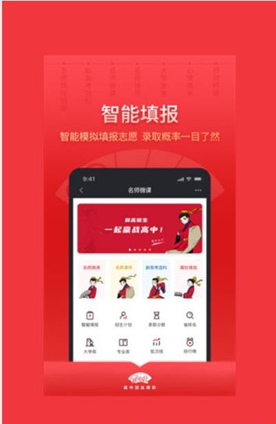 3、提供高中生态服务的软件平台,具有高校与专业信息查询、选科测评与推荐、志愿模拟与智能填报、名师微课等功能。