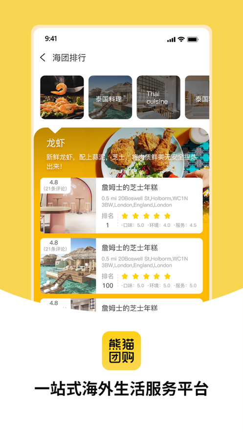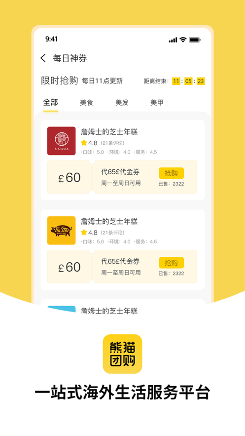 熊猫团购app是一款非常好用的同城电商软件,可以根据用户的地理位置来定位到所在的城市,线上能够看到周边的商家信息,可以线上点外卖,下单消费还会有专属的折扣能够领取到,来这里能够体验到高质量的生活方式,不需要出门就可以完成一些事务的办理!