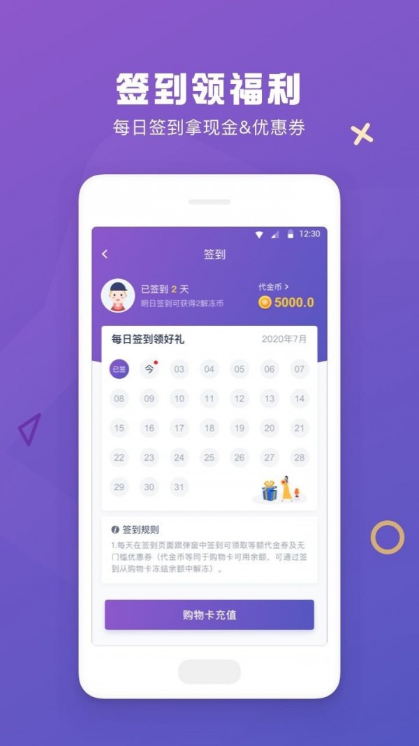 3、加入购物卡、签到等功能,用户可以选择购物卡、余额等方式进行消费。