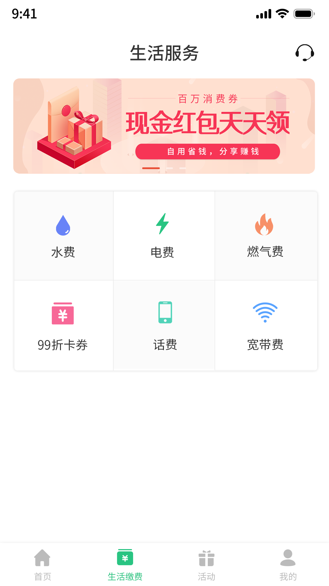我们提供水,电,气,手机,固定电话宽带等服务,并购买优惠卡和优惠券