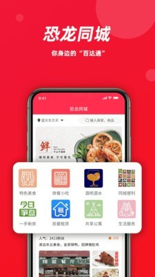 恐龙同城是一款提供同城服务类的手机软件,可以满足用户生活中的衣食住行,提供了全面丰富的功能,用户可以在线寻找周边美食,休闲娱乐的场所,还可以自助点餐,找酒店民宿等等,一站式的为用户的日常生活服务,提高生活质量!