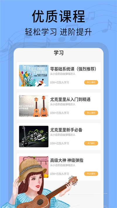 轻轻松松零基础入门。应用内包含了优质的弹唱视频教程和调音课程,调音小技巧让你迅速掌握尤克里里弹出美妙的音乐。