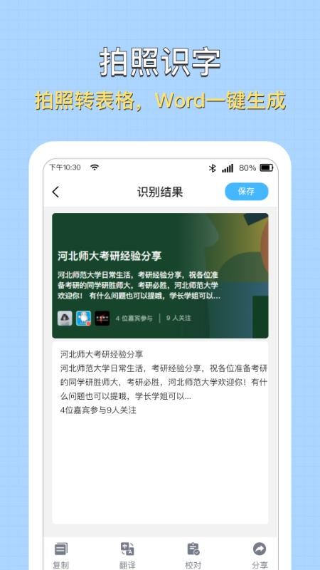 全能扫描图片转文字识别是一款功能强大的图像识别软件,可以帮助用户快速识别图像的文本信息,准确转换,在平台上清晰显示,实时查看,获得更多的识别服务,增加用户体验,快速解决你的识别需求,让你更好的使用;平台的识别功能非常丰富,包括文字识别、手写识别、照片翻译等识别类型。