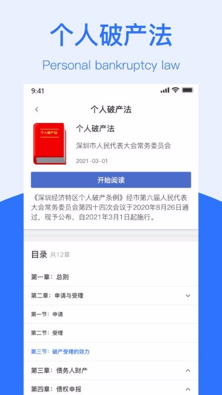 1.可以在线阅读个人破产法,也可以根据目录选择性阅读;