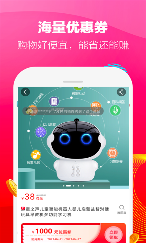 4、帮助您使用优惠券再进行购物,省去超多的资金花费。而且平台中更有众多的限时优惠活动为您推送。