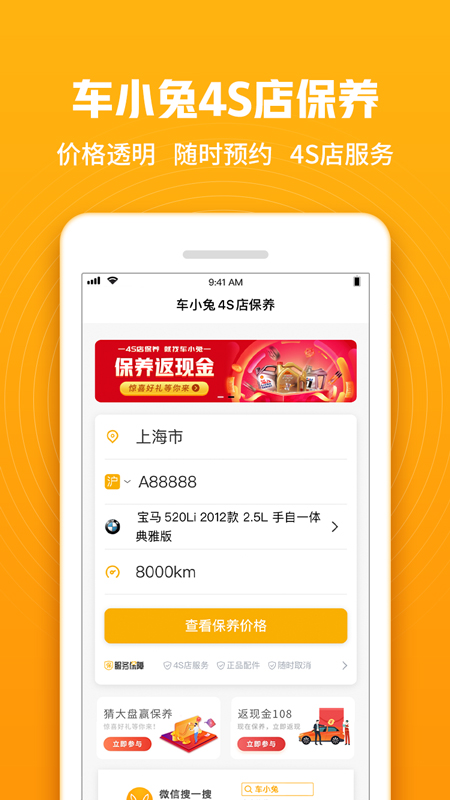 车小兔app是一款专门汽车开发的维修服务软件,能做到价格优惠,还能在平台上提前预约,让你的爱车得到更好的养护,在平台上还有优惠的保养套餐,还能道路救援,拖车等等各种服务项目。能在线上和线下服务模式,质量高,服务好,价格优惠力度大,节日的活动让有车的人想受到应有的优惠!