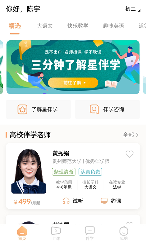 星伴学app是一款用户优质的辅导教学软件,软件中可以营造更轻松预约的教学氛围,深受大家喜欢哦,快来试试吧!