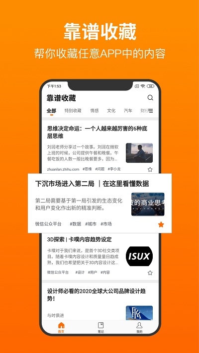 2、碎片化阅读集中收藏,智能分类文章,也可以记录捕捉自己的灵感,在线离线都可以使用;