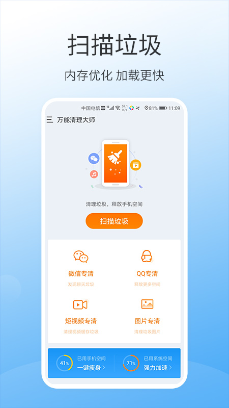 快速释放手机内存,实现手机运行畅快。深度清理微信垃圾,实现聊天无障碍。