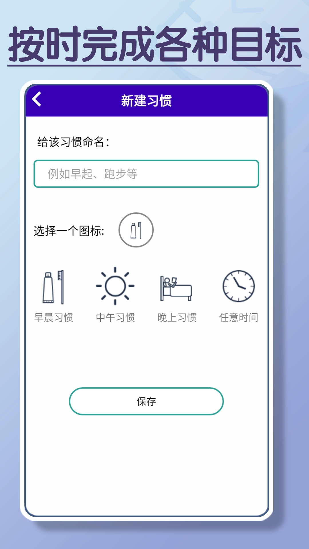 3.自定义各种小目标设定时间,让用户能按时的完成目标。