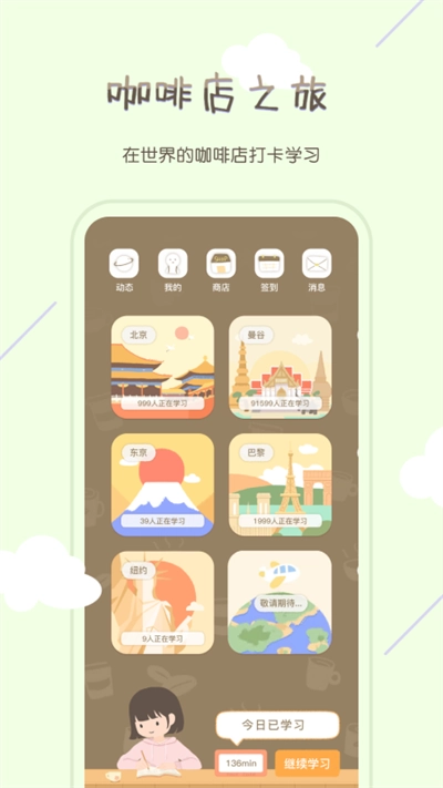 3.在你喜欢的城市创建自己的咖啡店,让你的朋友一起学习,互相陪伴,互相鼓励。