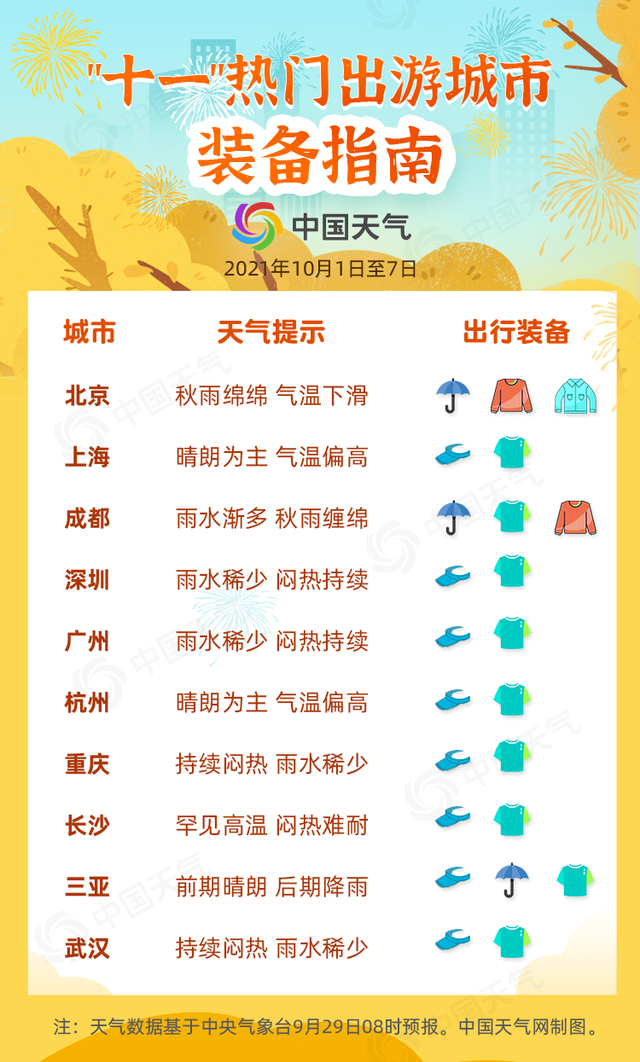 2、中国天气网推出“十一”假期全国天气地图,还有十大热门出游城市装备指南;