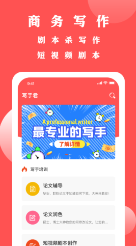 2.关于新手用户,平台中还有能够让用户进行教导学习的写手培训,包含但不限于论文教导、论文润色、以及短视频剧本的制作,让用户快速的上手。
