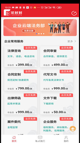 软件中有很多企业常用的服务供用户选择使用,包括但不限于法律信息、合同审查、合同制定、文书撰写、律师函出具、案件委托等。