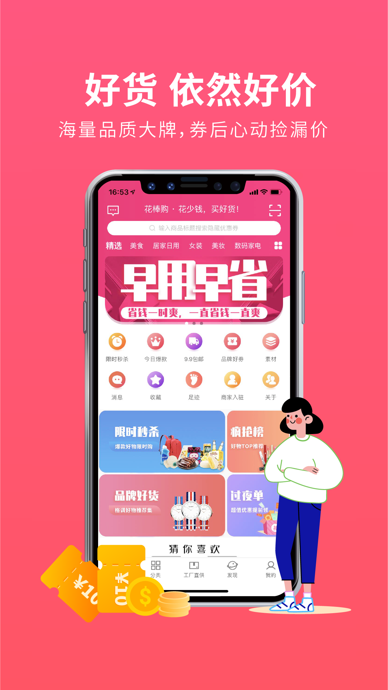 花棒购app是一款优惠购物的手机软件,精选整合了全网优质的商品货源,各种类型的商品应有尽有,用户想要购买的商品都能够在上面找到,每天还会不定时的更新上架,用户在下单购物的同时还可以享受到诸多的优惠,每天都有不同的折扣活动在等着您!