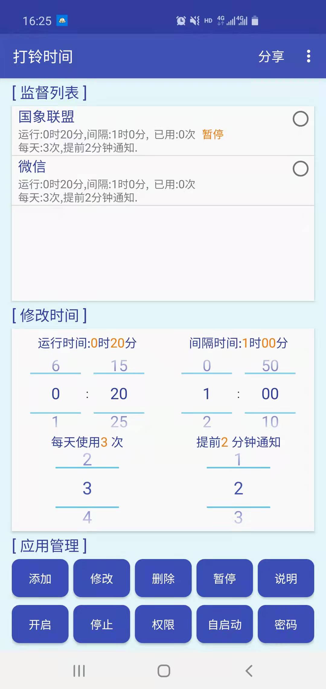 2、输入一个预期的使用时间,在这个时间过后该应用将无法使用,直至退出后再次开启;