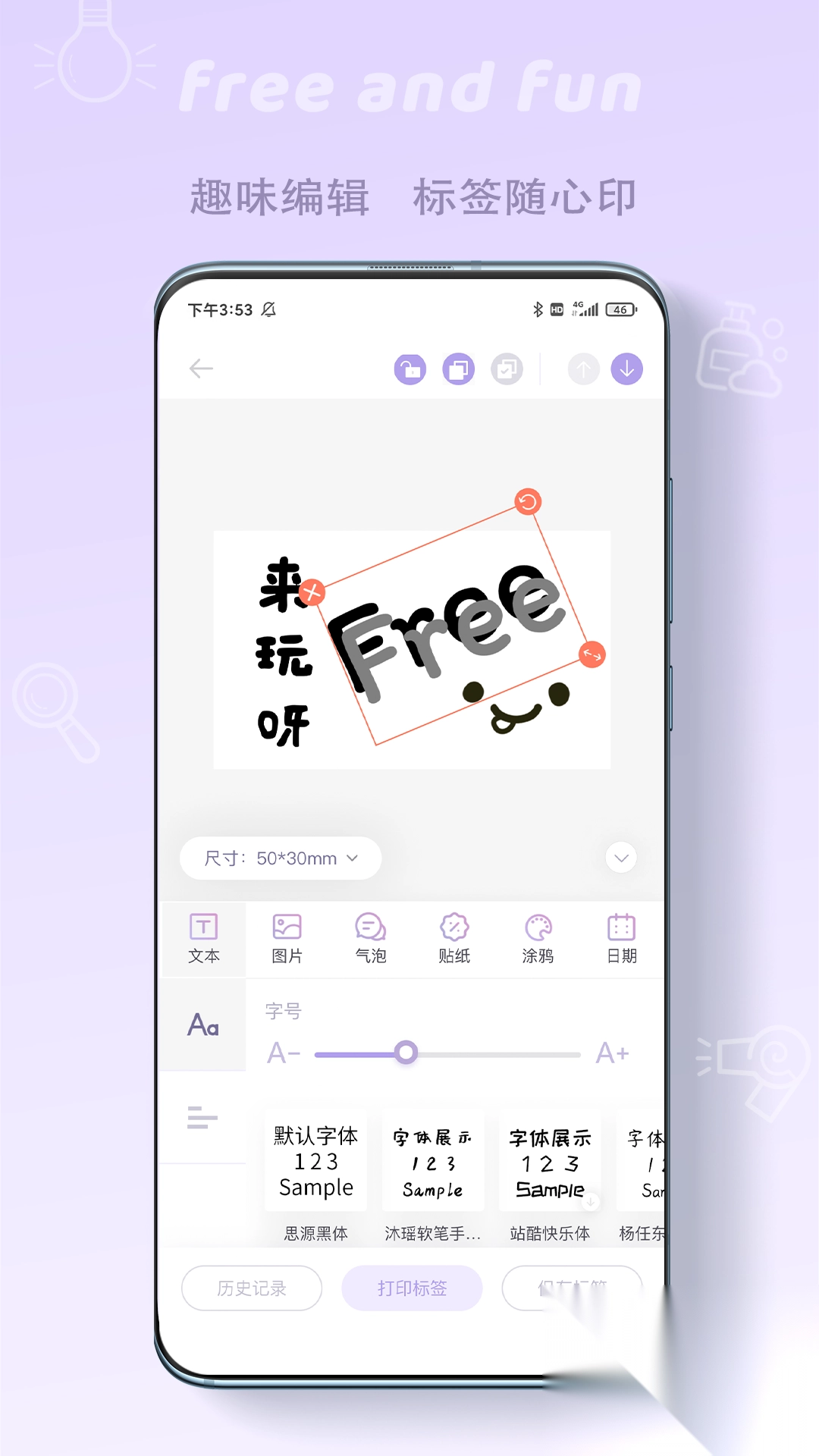 2、APP内自带丰富字体、图标、涂鸦等个性化功能,可以轻松制作出多种精美标签,