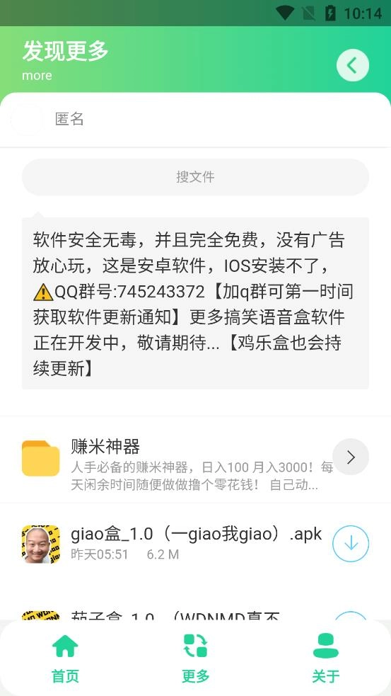 giao哥盒是一个非常流行的语音聊天包。该软件在网上收集了很多流行语录,用起来很有意思。小伙伴们可以尝试一下,自己使用,和朋友们进行社交互动。它可以烘托气氛,每天给周围的人带来很多快乐,让你心情愉快,同时,也可以增加与别人的交际。