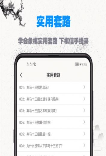1、一款给爱好者们推荐的象棋教程的软件,线上提供了丰富的知识学习;