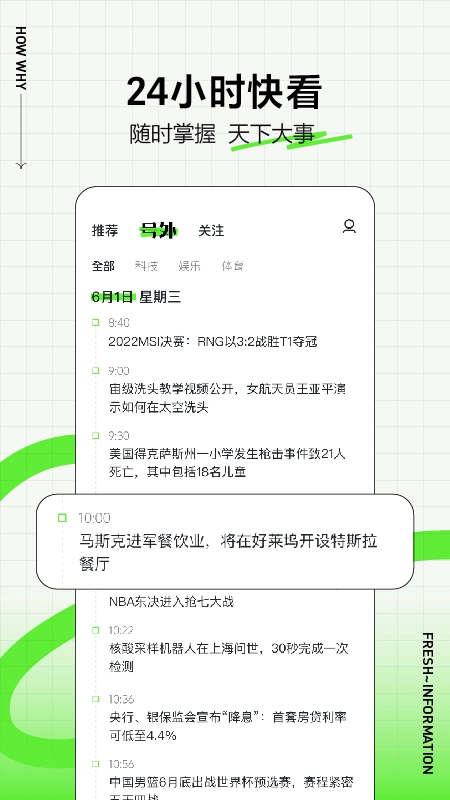 2、24小时快看,随时掌握,天下大事,每天都有最新的资讯内容更新哦。
