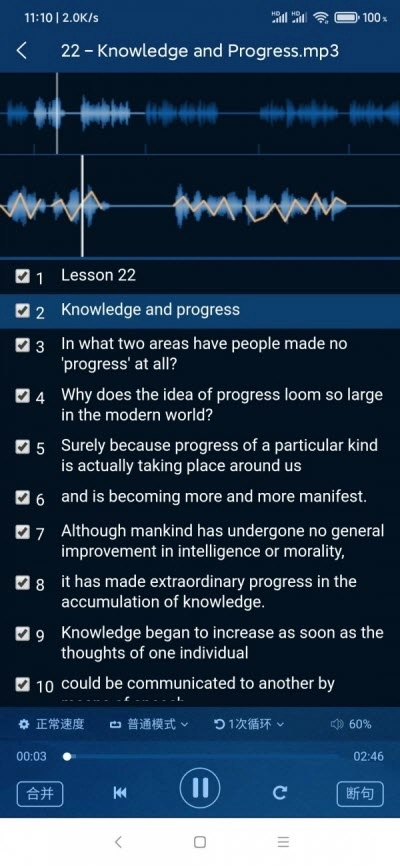 4. 声音波形同步显示:听力练习以波形图为主导,多种方式选择复读区间,便于局部重点复读。