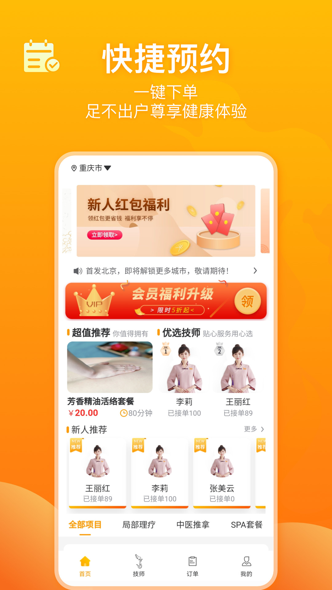 优质实用的上门按摩服务app,里面的按摩技师都通过了严格的培训审核,用户足不出户就能够享受优质的按摩服务!