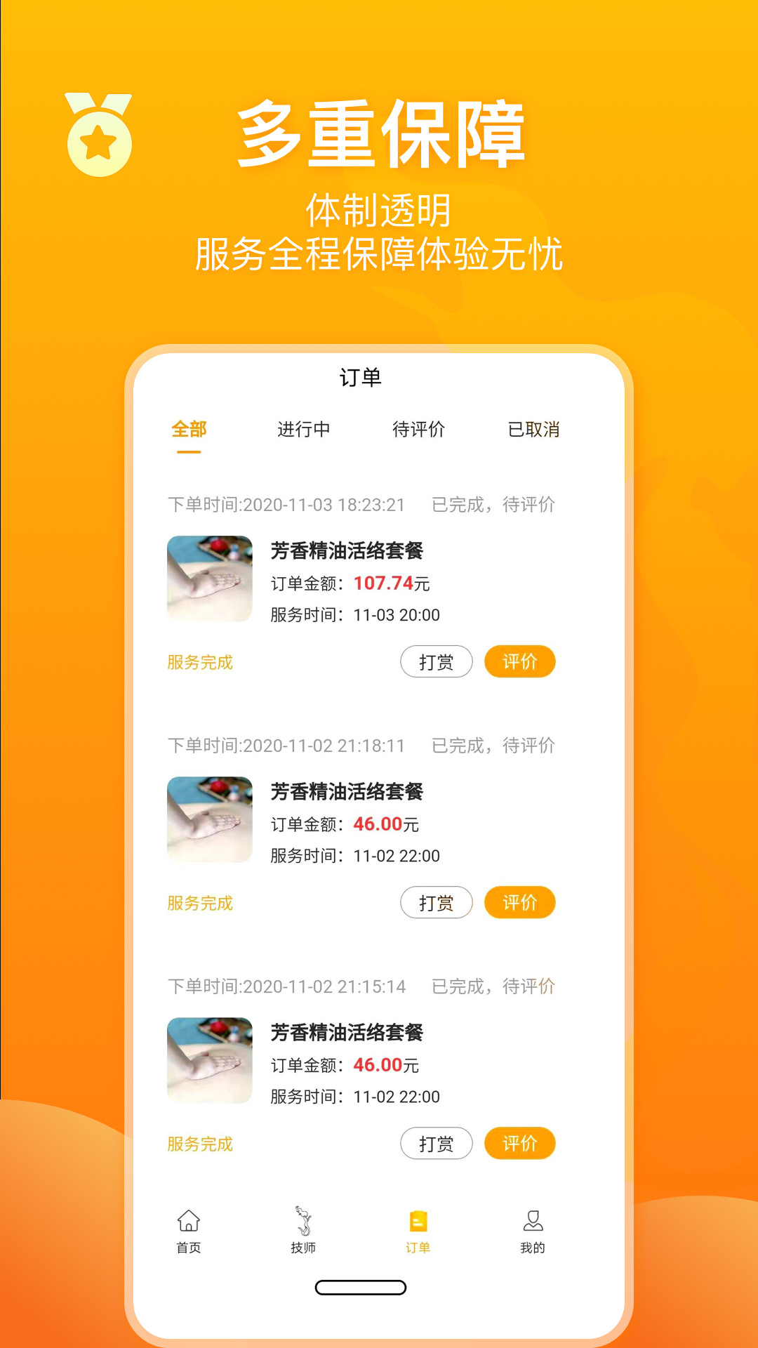3、严选经验技师,入驻平台根据距离、单量、评分等排序为用户提供按摩服务。