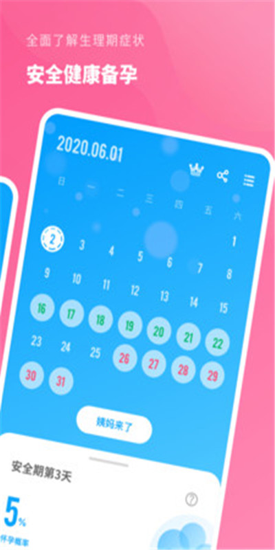 全面记录和跟踪生理期,科学计算排卵期,安全期和姨妈期,使准备过程更加科学。