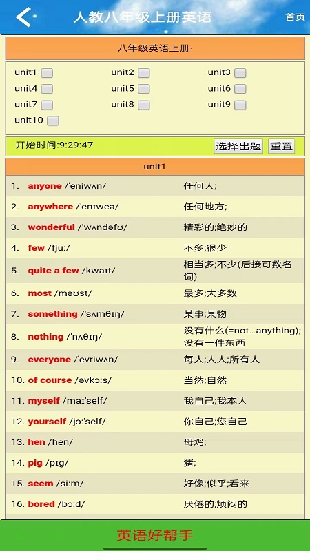 2、所有课文的单词、词组的在线自测(有计时、评分功能)。