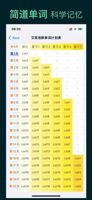 2、通过艾宾浩斯记忆算法,每天掌握新单词并进行复习。