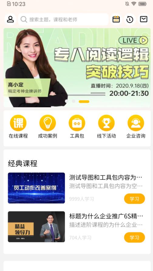 1、首页:课程学习相关,主要是课程学习、考试、练习等主要功能。