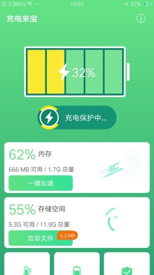 一键省电:一键关闭耗电应用,优化配置属性,简单快捷,直接省电。
