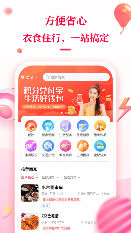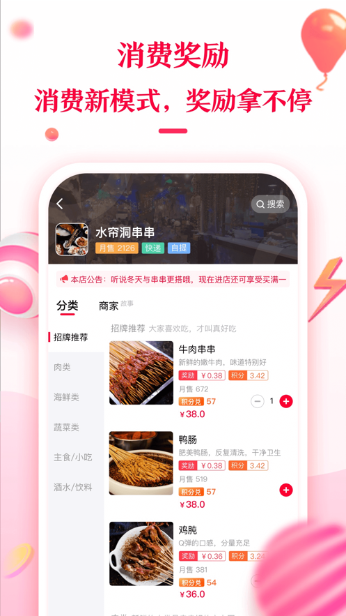 消费有奖励,分享能获益,千城万店积分,衣食住行兑付。