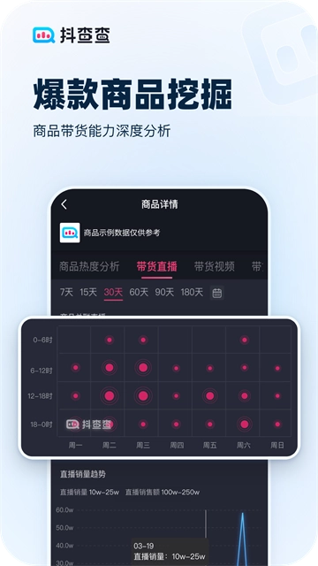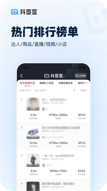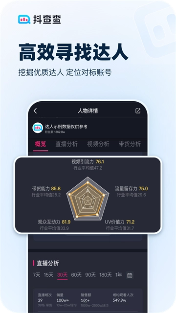 抖查查为用户提供直播、电商、短视频、达人等多维度的榜单排名及数据分析,同时提供分钟级数据监测功能,时下热门的视频/音乐素材,帮助达人/电商团队/企业实现短视频和直播电商的商业变现,助您随时随地查直播、电商、短视频数据。