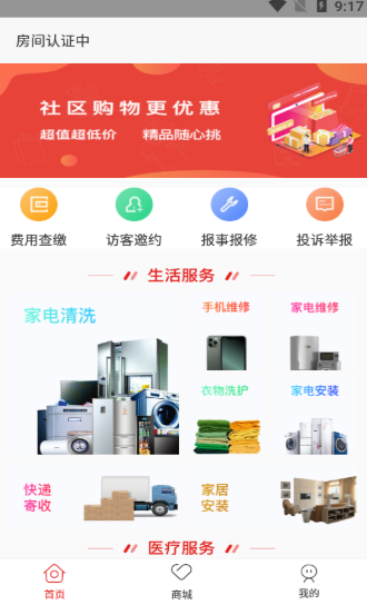 2、主要功能包括费用查缴、访客邀约、报事报修、投诉举报、生活服务、医疗服务、物业在线、线上商城等;
