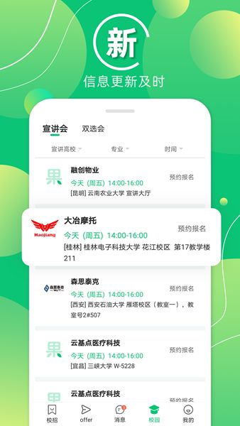 1、【全】校园招聘信息全:全职、实习、宣讲会应有尽有!2、【准】准确规范:校招信息精准无误,值得信赖!3、【真】严格人工审核:信息真实有效屏蔽虚假招聘!