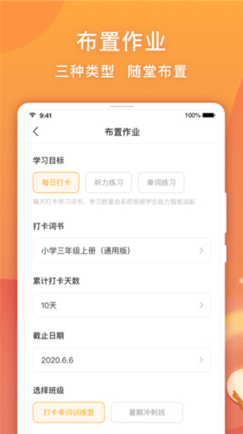 因人而教,针对每个学生的学习情况,更有针对性的布置单词作业,三大作业类型,练习、听力、打卡。针对单词薄弱的学生可以留“打卡”作业,让该学生培养起天天背单词的习惯。