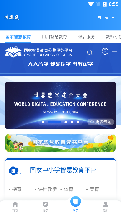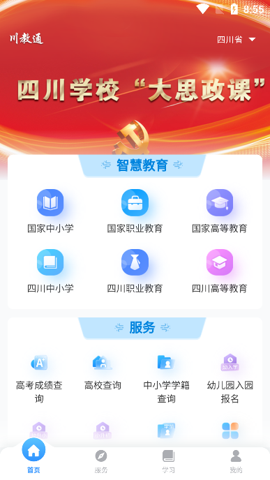 川教通是一款教育资源非常全面的在线教育学习软件,汇集国家智慧教育平台和四川省智慧教育平台的功能,提供中小学招生、学籍查询校准、成绩查询、学校信息查询等服务,方便快捷的服务保障,引领教育未来!