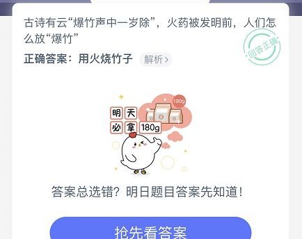 蚂蚁庄园爆竹声中一岁除是一个非常有意思的科普小知识软件,软件中具有多样的冷门知识,在平台上答对问题就可以获得饲料喂养自己的小鸡,非常有意思,每天都会有不一样的问题更新,新鲜感也是非常不错。