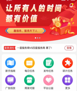 趣服务app是一款服务风场广泛,且综合性很强的赚钱软件,软件中具有海量不同类型的任务可以去完成,都非常简单没有难度,只要动动你的手指就能完成指定的任务,趣服务让你轻轻松松就能赚到大钱,大大提高了店铺的营销方式。
