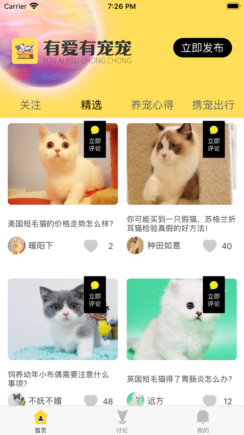 有爱有宠宠app是一款专门针对养猫量身制定的手机端必备的养猫软件,如果你特么喜欢猫猫,千万不要错过,软件中可以在线帮助养宠用户解决各种宠物喂养难题,讨论区可以发布讨论你在养猫生活中遇到的各种问题。