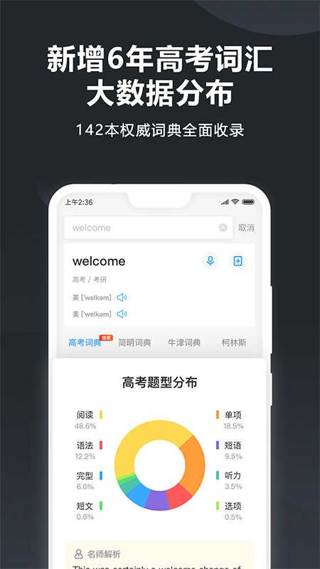 高考、四六级、考研历届真题试卷全覆盖,名师在线专业讲解,大数据分析考试试卷,单词频率、常考解释、必备考点、考试趋势一查便知。