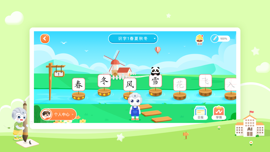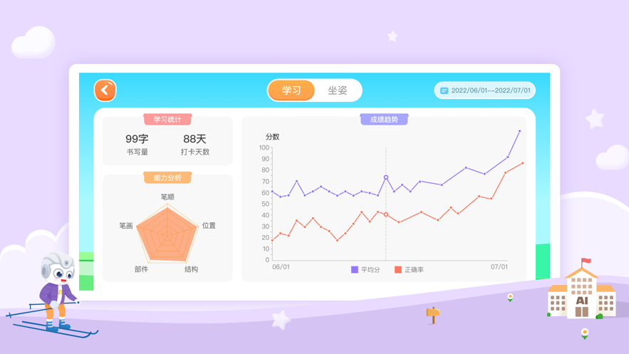寓教于乐,精心设计“教、学、练、测、评”学习闭环,让孩子在智慧学伴的陪同下,端正坐姿,科学练字,趣味学习每一天!