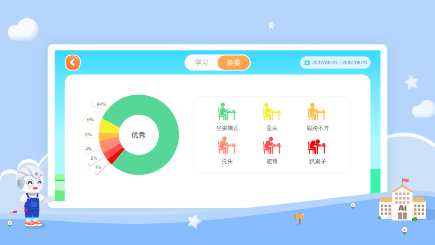 3、坐姿监督:实时监督并纠正孩子的坐姿,并根据坐姿情况形成报告;