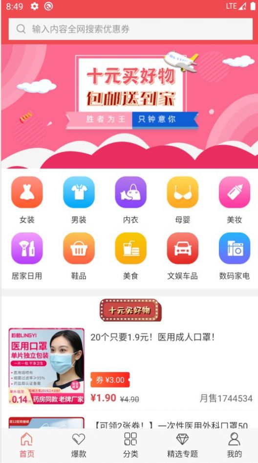 1.精选多个平台优质商品,十元买好物,价格更低廉。服装、箱包、美妆;