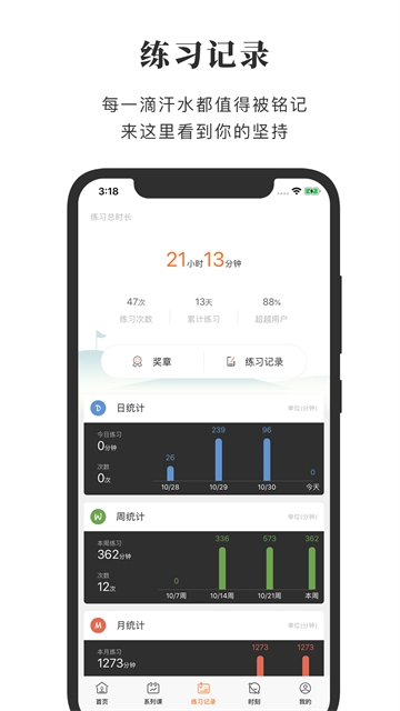 APP设计了奖章体系,每一枚练习奖章都需要坚持练习才能达到。虽然这些奖章获得之后目前没有设计会员奖励服务,但是它对于你而言依然是弥足珍贵的,如下图所示,练习记录这个模块,还有丰富的练习数据统计功能。以日、周、月的维度全方位地展现你始终如一的练习过程,每一个维度下都有快捷的数据分享功能,方便跟朋友展示: