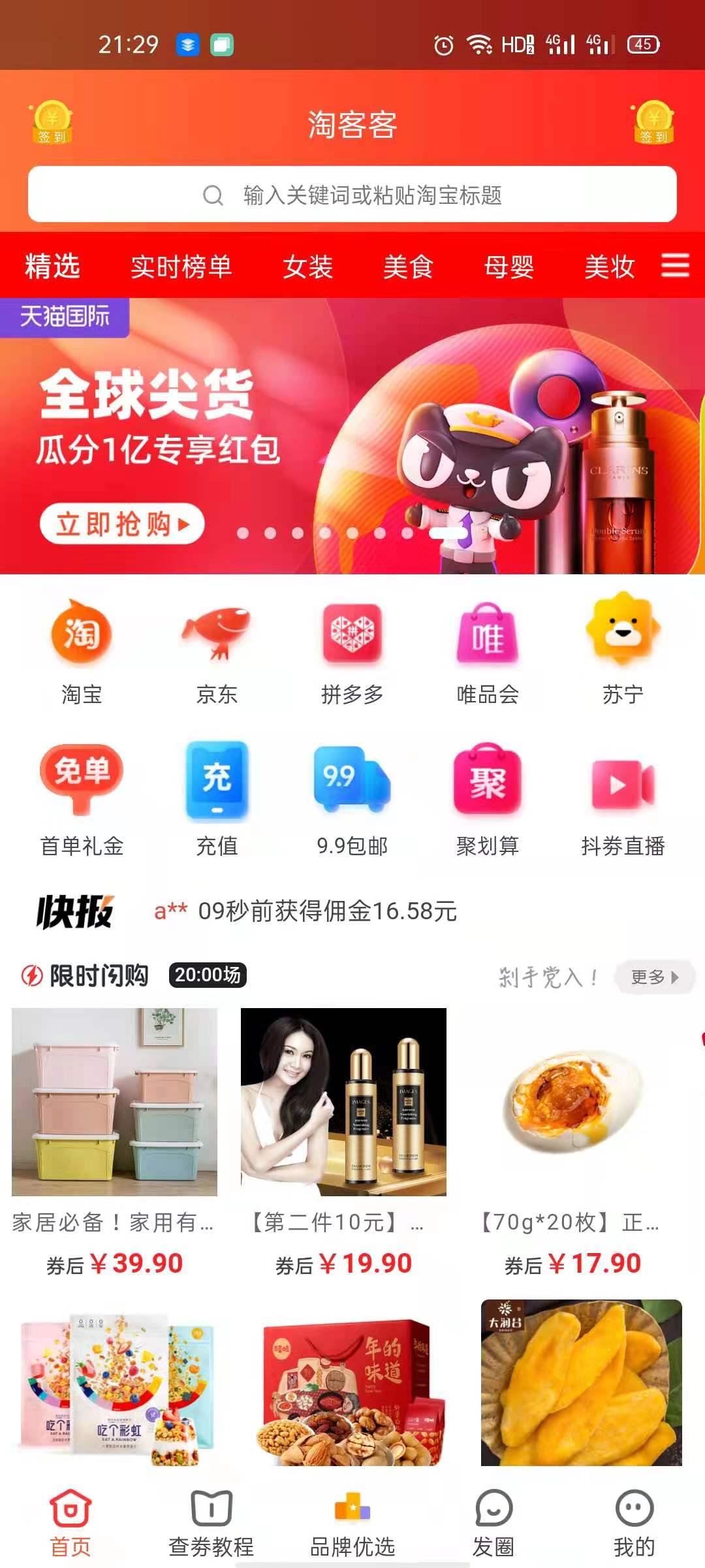 淘客客app是一款热门的手机购物软件,精选了海量的优质好物,各种类型的商品应有尽有,有着详细的标签和分类,用户需要的商品都可以从上面找到,每天都会实时的更新最新的爆款商品,用户在下单购物的同时还可以享受到诸多的优惠!